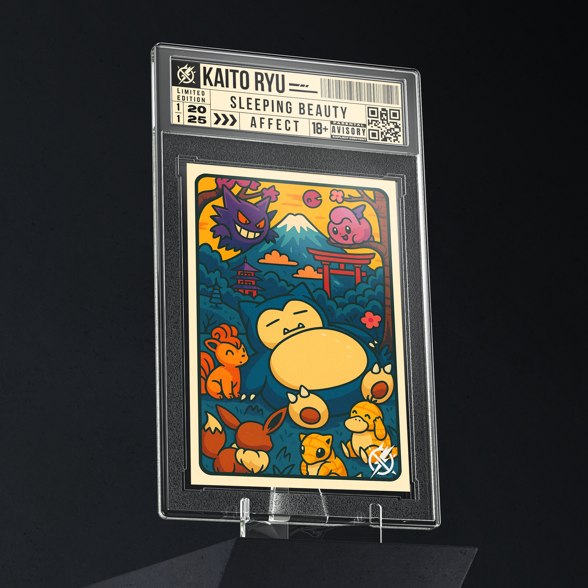 This one-of-a-kind art card by Kaito Ryu (海竜) captures a sleepy gentle giant napping in a peaceful Japan scene. Cherry blossoms drift, a red torii and a distant Mt. Fuji frame the moment, while small friendly critters gather quietly around. Bold black lines, bright colors, and a clean hand-drawn look make the calm mood pop on a small card.